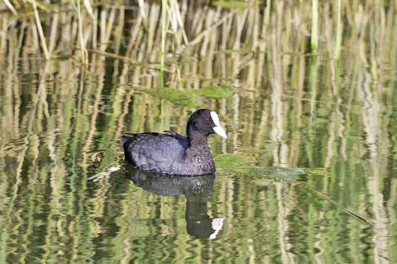 Coot: All-black and larger than its cousin the Moorhen, it has a distinctive white beak